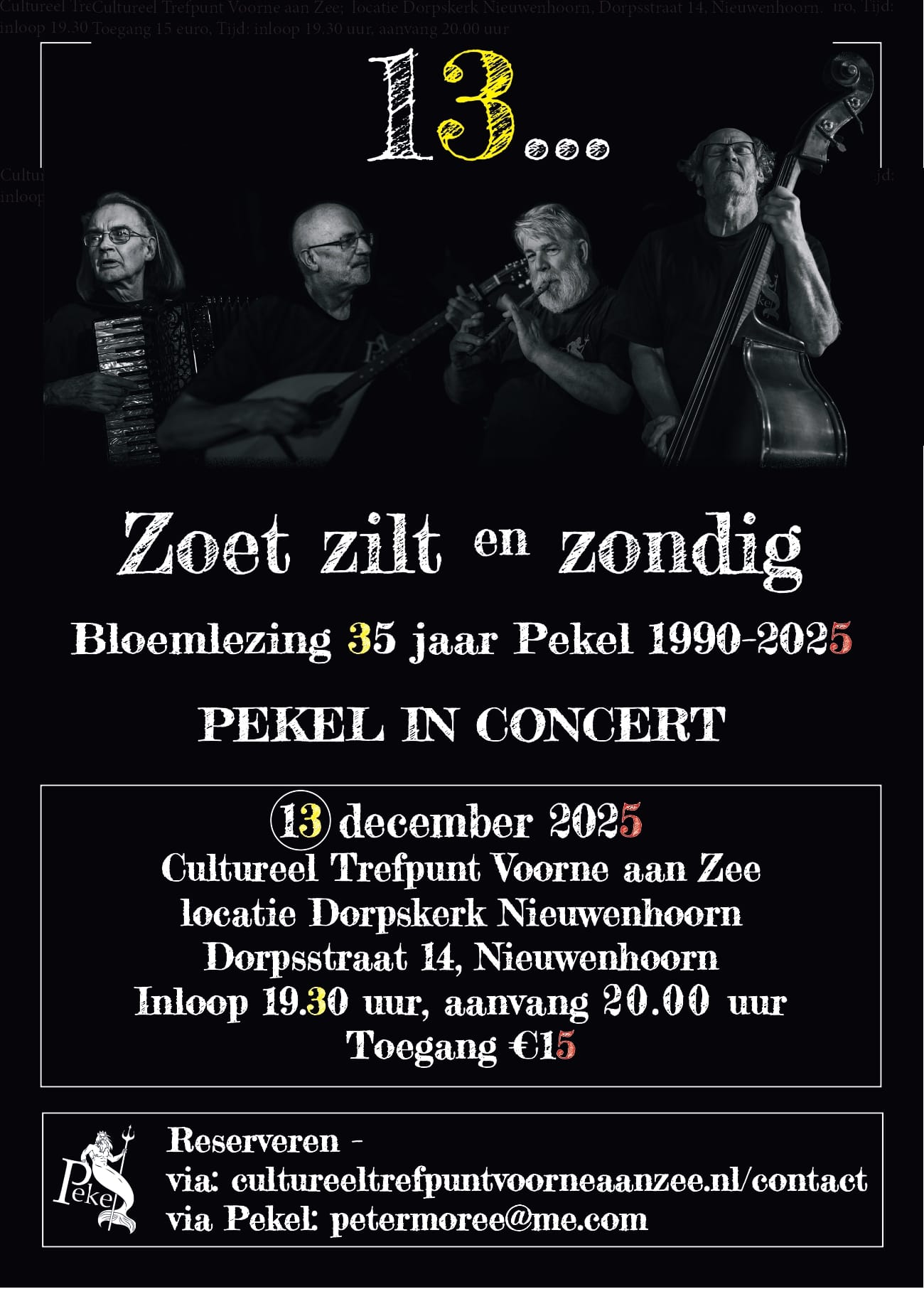 Al 35 jaar weet folkband Pekel publiek over heel Nederland te verrassen en te ontroeren. Deze bijzondere band brengt hun jubileumtour “Zoet, zilt en zondig” ook naar het Cultureel Trefpunt Voorne aan Zee – een unieke gelegenheid om deze populaire band in actie te zien.